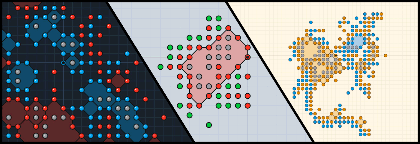 Ваше завдання — оточити ворожі точки своїми точками так, щоб усі ваші точки можна було з'єднати разом, утворюючи паркан навколо ворожих точок. Оточені точки вважаються "захопленими" і не можуть бути використані ворогом.